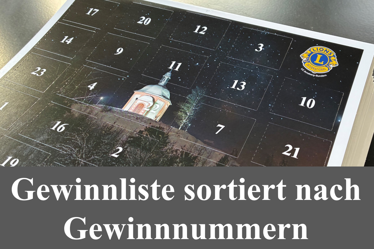 Ab dem 24.12.2025 können Sie hier prüfen, ob Ihr Kalender (Seriennummer oben links) einen der vielen attraktiven Preise gewonnen hat. Die Gewinnnummern sind übersichtlich sortiert aufgelistet. Wir gratulieren allen Gewinnern herzlich und danken allen Sponsoren, Spendern und Käufern des Kalenders für ihre Unterstützung!