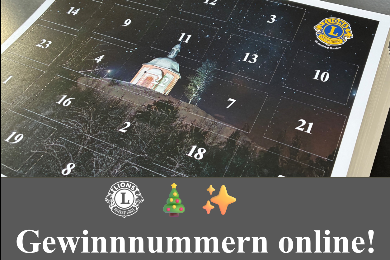 Herzlichen Glückwunsch! Mit dem Kauf eines Lions-Adventskalenders haben Sie bereits etwas Gutes getan und dazu beigetragen, dass wir in Arnsberg und Sundern Menschen unterstützen können, die Hilfe benötigen. Dafür bedanken wir uns herzlich! Auf dieser Seite können Sie nun nachsehen, ob Ihr Kalender (Seriennummer oben links) einen der vielen attraktiven Preise gewonnen hat. Jeden Tag öffnen wir ein neues Türchen und veröffentlichen die jeweiligen Gewinnnummern.