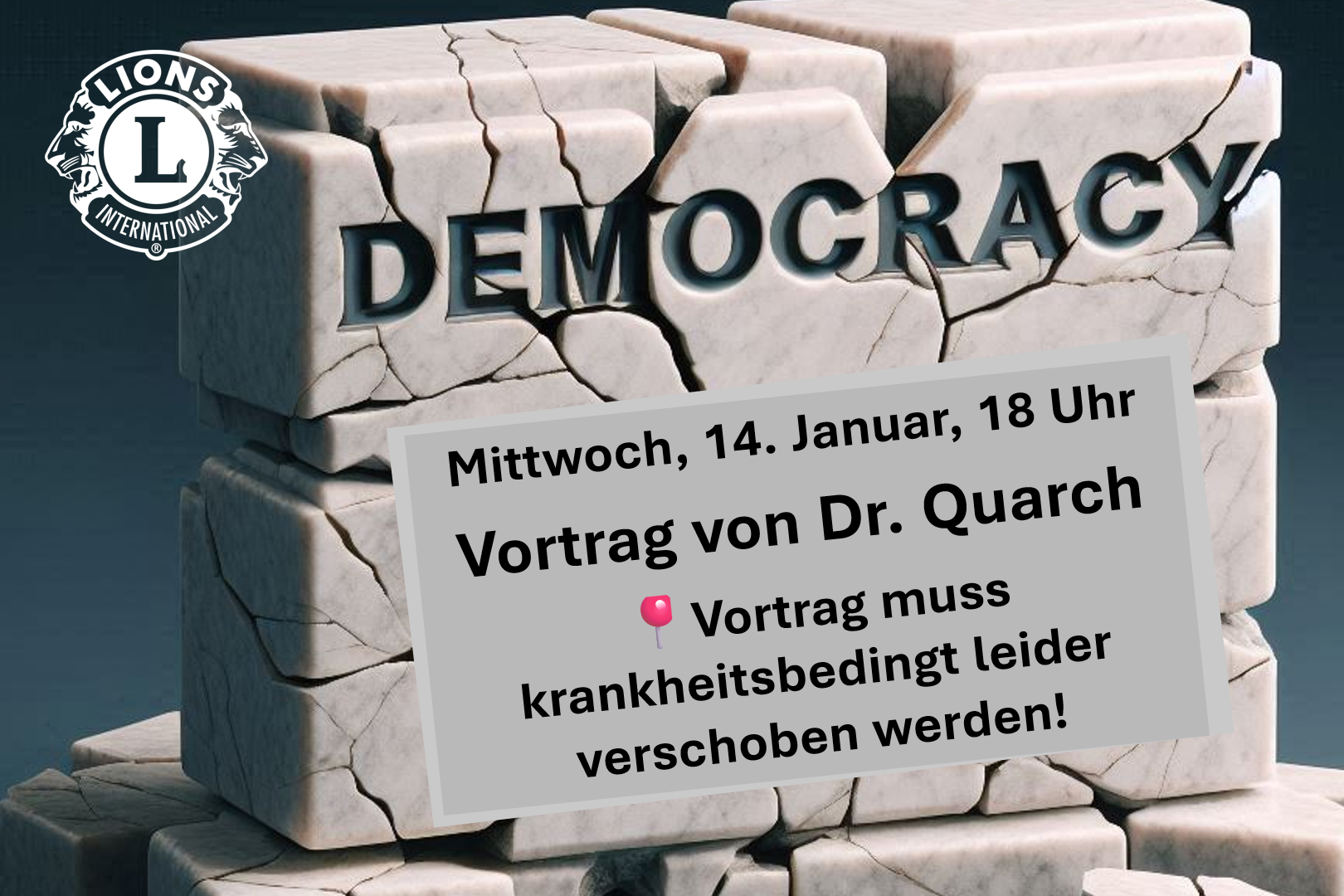 Club-News vom 10.01.2026: Der für Mittwoch, 14. Januar 2026 geplante Vortrag „Warum Demokratie? – Über den Sinn der Politik und das Glück des Menschen“ von Dr. Christoph Quarch muss krankheitsbedingt leider entfallen.
